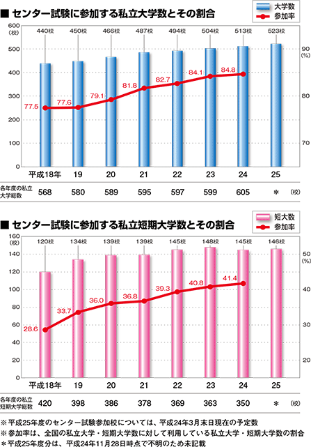 | データ資料: | 「平成25年度大学入学者選抜から大学入試センター試験に新たに参加する大学等に ついて」より<独立行政法人 大学入試センター> 私立大学・短期大学総数については、各年の学校基本調査報告書より<文部科学省> ※平成24年度は、平成24年度学校基本調査速報(平成24年8月発行)より |