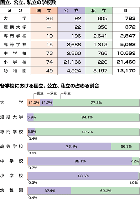 | 私立の学校の占める割合は、幼稚園で62.2%、小学校で1.0%、中学校で7.2%、高等 学校で26.3%となっています。 |