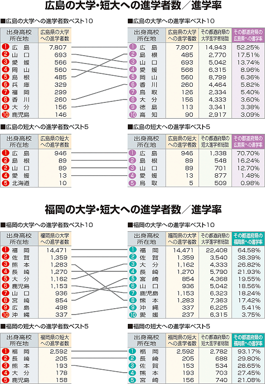 広島、福岡への進学者数と「大学・短大進学者のうち何%が広島、福岡に進学したか」という進学率の2つの視点から都道府県別にまとめました。