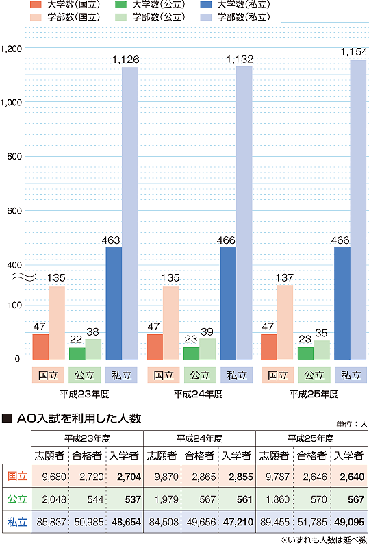 | AO入試を実施した国公私立の大学・学部数(平成23~25年度) |