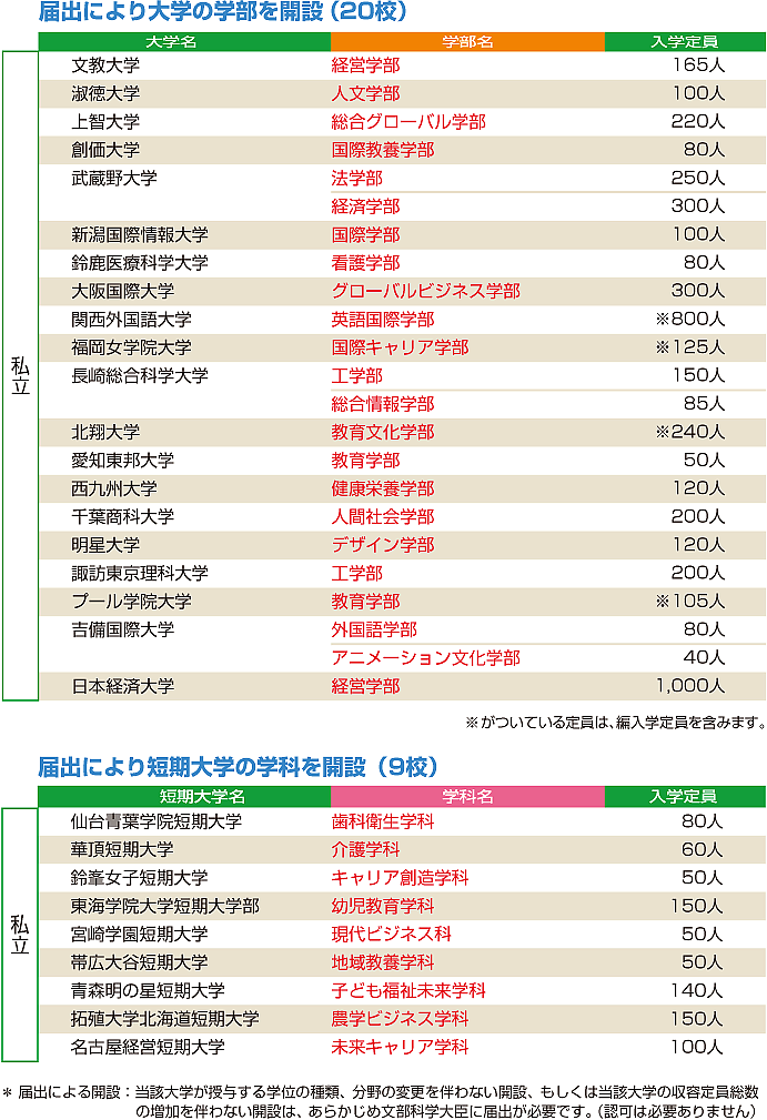 | データ資料: | 平成26年度開設予定の大学の学部等の設置届出一覧 |