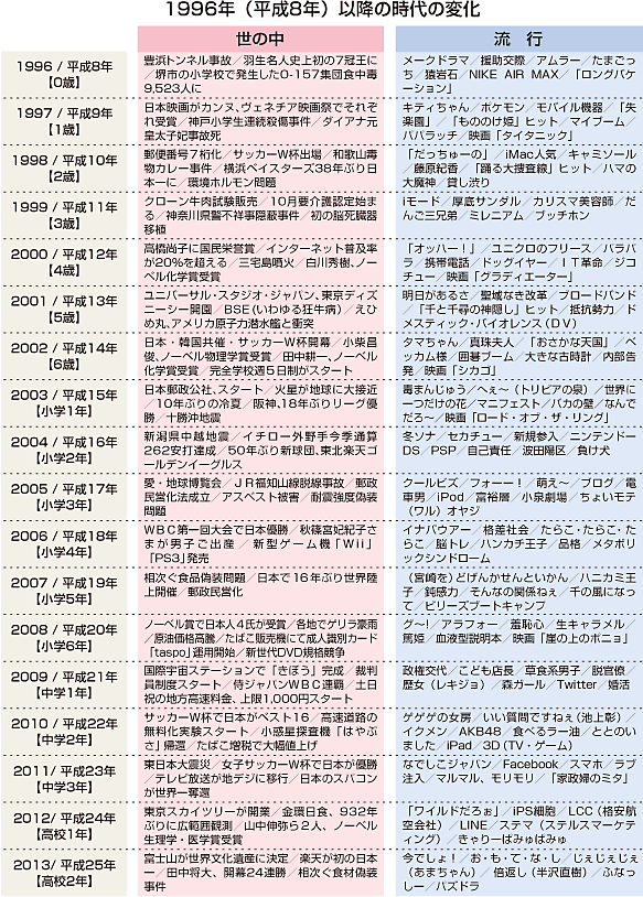 現在の高校3年生が生まれた年から、昨年までの「世の中」と「流行」をまとめました。彼らの人間像を理解するための一助としてご高覧いただければ幸いです。