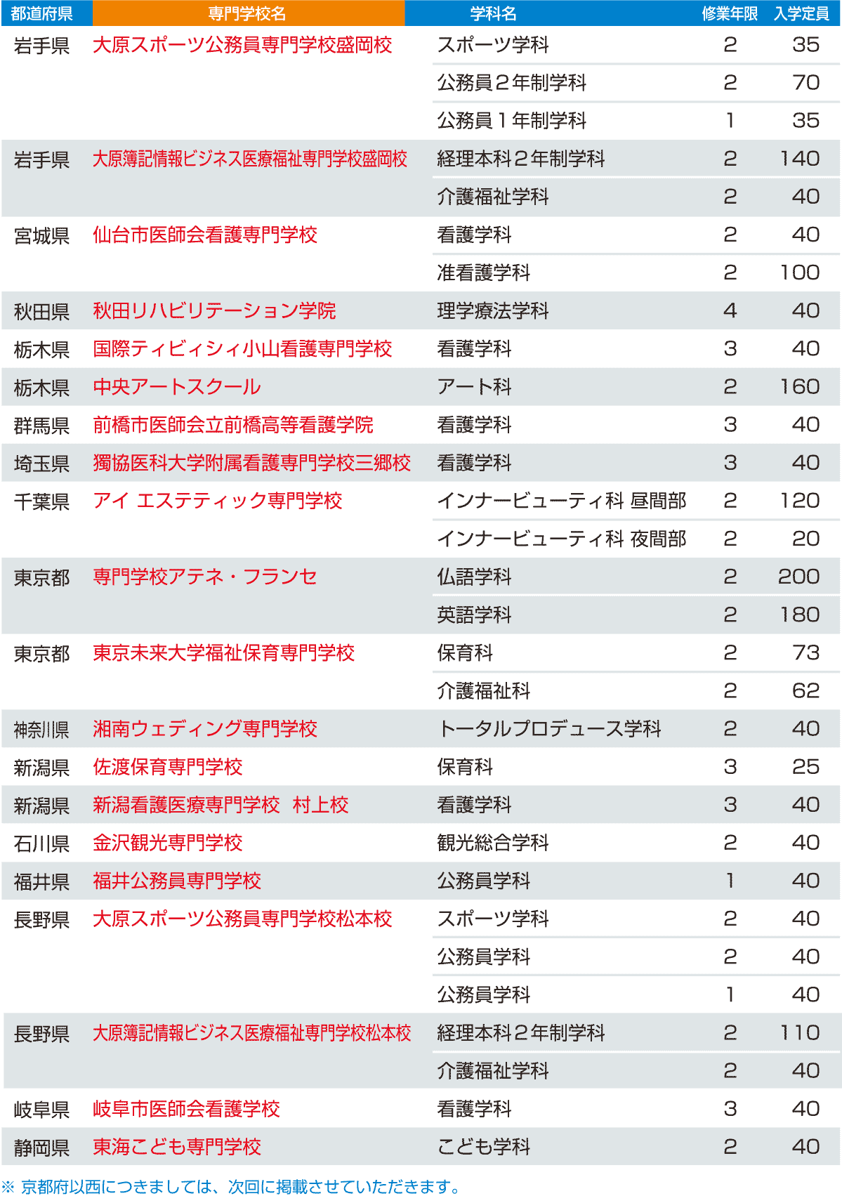 | ※ | 各都道府県にて認可を受け、2015年4月に開校された私立の専修学校の専門課程を記載しています。 各都道府県の私立学校担当の部署へ調査した結果です。 |