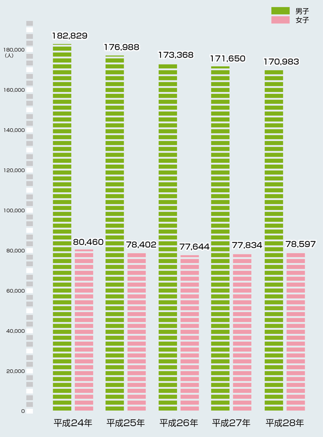 | データ資料: | 各年の学校基本調査報告書(文部科学省) 平成28年は学校基本調査速報(平成28年8月発行)よりグラフにして作成。 |