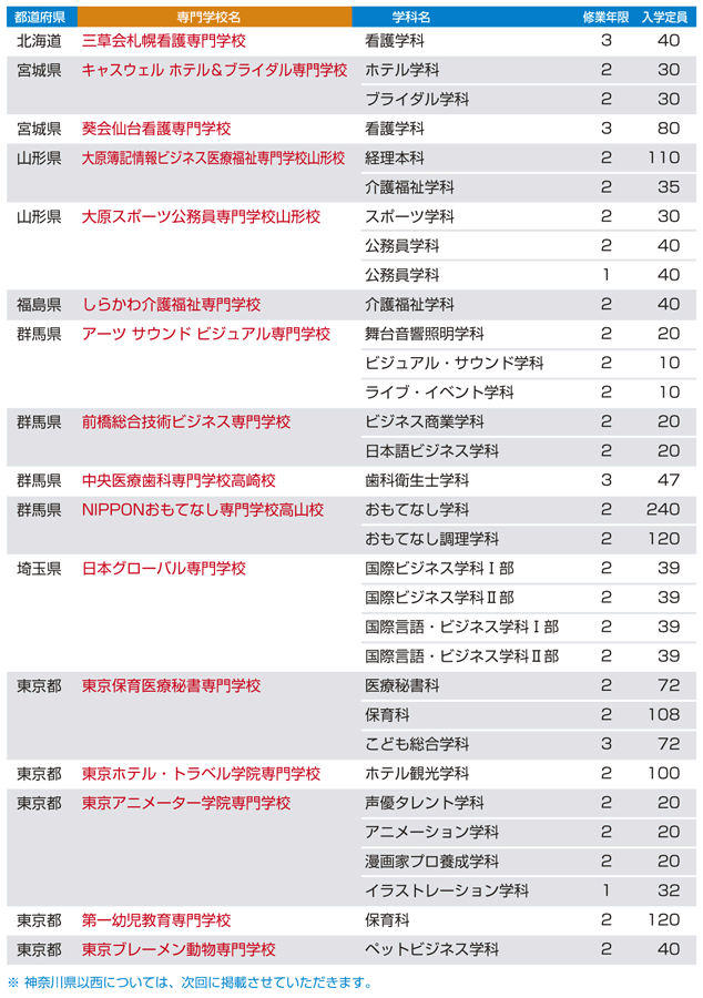 | ※ | 各都道府県にて認可を受け、2017年4月に開校された私立の専修学校の専門課程を記載しています。 各都道府県の私立学校担当の部署へ調査した結果です。 |