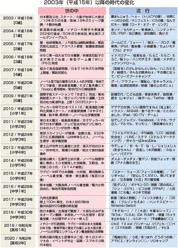 | 高校3年生が経てきた社会(2) | 現在の高校3年生が生まれた年から、昨年までの「世の中」と「流行」をまとめま した。彼らの人間像を理解するための一助としてご高覧いただければ幸いです。 |
