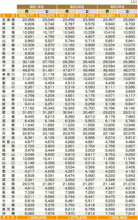 都道府県別高校生徒数(全日制)