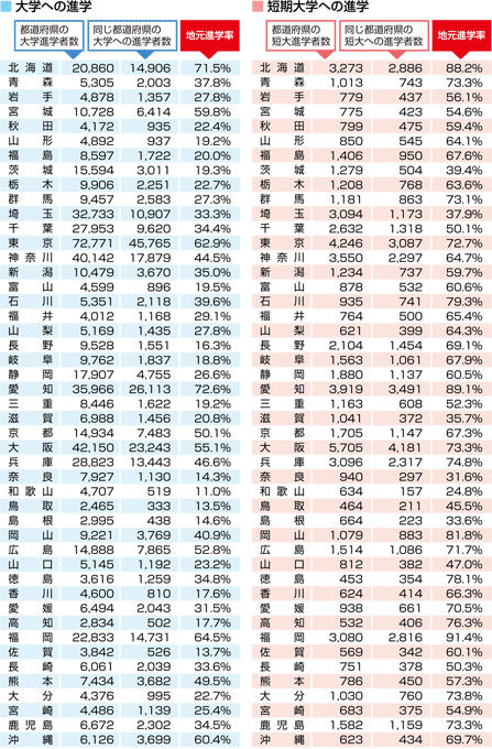 | 2010年に大学・短期大学へ進学した者(浪人含む)のうち、出身高校と同じ都道府県の大学・短期大学へ進学した割合です。 |