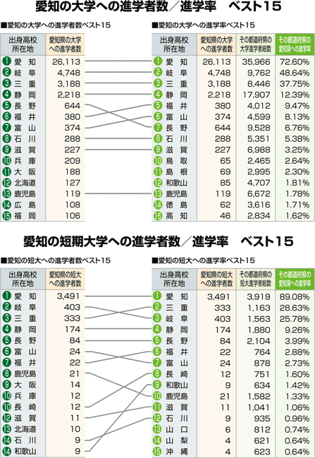 愛知への進学者数と「大学・短大進学者のうち何%が愛知に進学したか」という進学率の2つの視点から都道府県別にまとめました。