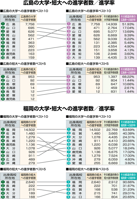 | 広島、福岡への進学者数と「大学・短大進学者のうち何%が広島、福岡に進学したか」という進学率の2つの視点から都道府県別にまとめました。 |
