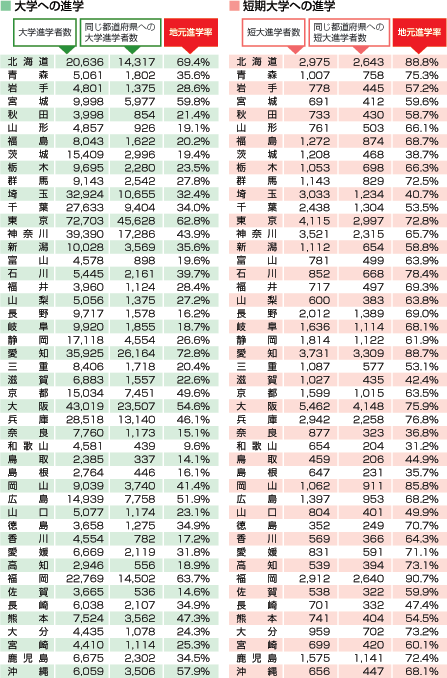 | 2011年に大学・短期大学へ進学した者(浪人含む)のうち、出身高校と同じ都道府県の 大学・短期大学へ進学した割合です。 |