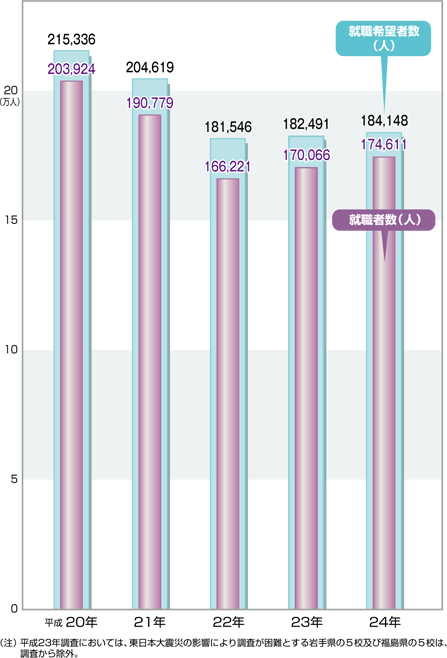 | データ資料: | 「平成24年3月高等学校卒業者の就職状況(平成24年3月末現在)に関する調査について」 <文部科学省初等中等教育局児童生徒課> |