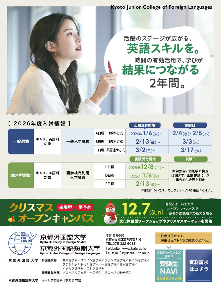 オープンキャンパス イベント一覧 すべて 来校型 オンライン型 12/7(日) 13:00~18:00 クリスマスオープンキャンパス 京都市右京区西院笠目町6 プレゼント特典あり 友達・保護者OK 奨学金制度の紹介 12/7(日) 13:00~18:00 クリスマスオープンキャンパス 京都市右京区西院笠目町6 プレゼント特典あり 友達・保護者OK 奨学金制度の紹介 開催スケジュールがありません。 オープンキャンパスのチェックポイント Q. オープンキャンパスに行くメリットは? A. パンフレットやホームページではわからない学校の雰囲気や特徴を知ることができる。オープンキャンパスは、校舎や施設を見学し、説明を聞いたり、質 問したりすることで、学校の雰囲気や特徴を知ることができるイベントだ。興味のある学校にいくつか参加して比較しよう。 ①入学後の生活をイメージできる 学校の雰囲気が体感でき、また授業・実習を体験できるので、入学後のイメージができる。 ②疑問を解消できる 先生や在校生に、入試や授業、学生生活で気になることなどを直接質問ができる。 ③モチベーションがアップする キャンパスを見たり、授業などを体験することで受験や進学へのモチベーションがアップする。 ④入学後のミスマッチが防げる 入学後に「イメージと違った、こんなはずではなかった」と悔やまないように、入学前に学校への理解を深めることができる。 もっと見る Q. オープンキャンパスってどんなことをするの? A. キャンパス見学や体験授業、学校の説明や個別の相談会など、学校を知ることができる絶好のチャンス!オープンキャンパスは、各学校が独自に工夫を凝らしたものとなっ ている。また、友人と参加できるのはもちろん、保護者の方が同伴できるものも多く、保護者向けの説明会や相談会を同時に開催する学校も増えている。オープンキャンパスは、気になる学校をじっくりと観察できる絶好のチャンス。その主な内容を見ていこう。 ●キャンパス見学ツアー 教室、図書館、食堂、体育施設などさまざまな施設・設備を見学。在校生たちがガイド役となって、説明しながら案内してくれる場合が多い。 ●模擬授業・体験授業 講義や実習などを体験することができる。実際に行われている研究や学びの内容を知る大変よい機会となる。 ●学校説明会 学校全体の説明から、学部・学科・コースの内容説明、就職支援体制や就職実績、奨学金制度の紹介などが行われる。保護者向けの説明会を設けている学校もある。 ●入試説明会 一見複雑な入試方式の特徴やポイントを解説してくれる。入試対策のアドバイスが聞けたり、入試対策講座を実施する学校もあるようだ。 ●個別相談会 学校の担当者に、入試、奨学金、就職支援などの疑問を個別に相談ができる。また保護者向けに個別相談の時間を設けている学校もある。 ●その他 オープンキャンパスの参加が、総合型選抜(AO入試)のエントリーを兼ねていたり、オープンキャンパス会場でエントリー受付を行っていたりする学校もある。 ■タイムスケジュール例1 9:30~ 10:00~ 10:30~ 11:10~ 12:20~ 本人 受付開始 学校説明会 模擬授業 キャンパスツアー 昼食 保護者 受付開始 保護者説明会 模擬授業 保護者相談会 昼食 ■タイムスケジュール例2 9:00~ 10:00~ 10:50~ 12:20~ スクールバス送迎 説明会 キャンパスツアー・ミニ体験授業 座談会形式「先輩と話そう」 ←―――保護者相談・個別相談(希望者)――――→ もっと見る Q. オープンキャンパスに行くための事前準備は? A. 参加予約などでスケジュールを決め、パンフレットを取り寄せて学校のことを事前に調べよう! いきなりオープンキャンパス当日に学校に行って、予約が必要だった、定員が一杯だっ た…など参加できないということにならないように、参加したい学校のオープンキャンパスに事前予約が必要かを調べ、予約できる場合は予約をしておくとあわてることがないだろう。 また、たくさんの学部や学科・コースがある学校では、さまざまなプログラムを用意しているケースが多い。知りたいことや体験してみたいことを整理し、当日参加したいプログラムを決めておくと、より効率がよいだろう。 オープンキャンパスでは、先生や在校生などに質問することも可能だ。そのために、学校のパンフレットを取り寄せて、学校のことや、興味のある学部・学科・コースのことをあらかじめ調べておき、気になった点や疑問点などは手帳やノートにメモしておいて、チャンスがあれば当日確認しよう。 もっと見る Q. オープンキャンパスに参加するときの服装は? A. 学校の担当者に不快感を与えるような服装は避ければ私服でもOKです!制服でも構いません。キャンパスツアーなど移動が多い場合もあるので、自分の動きやすい服装を選びましょう。 Q. オープンキャンパスの持ち物は? A. 筆記用具やメモ帳、学校の連絡先、地図や路線図など事前に準備をしっかりしよう。 Q. オープンキャンパスは親や友達と参加してもいいの? A. 保護者の方や友達と一緒