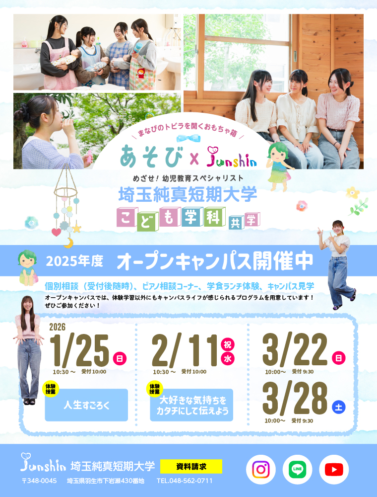 オープンキャンパス イベント一覧 すべて 来校型 オンライン型 随時 Webオーキャン 3/22(日) オープンキャンパス 埼玉県羽生市下岩瀬430 友達・保護者OK ランチ付き 参加する 3/28(土) オープンキャンパス 埼玉県羽生市下岩瀬430 友達・保護者OK ランチ付き 参加する 3/22(日) オープンキャンパス 埼玉県羽生市下岩瀬430 友達・保護者OK ランチ付き 参加する 3/28(土) オープンキャンパス 埼玉県羽生市下岩瀬430 友達・保護者OK ランチ付き 参加する 随時 Webオーキャン オープンキャンパスのチェックポイント Q. オープンキャンパスに行くメリットは? A. パンフレットやホームページではわからない学校の雰囲気や特徴を知ることができる。オープンキャンパスは、校舎や施設を見学し、説明を聞いたり、質 問したりすることで、学校の雰囲気や特徴を知ることができるイベントだ。興味のある学校にいくつか参加して比較しよう。 ①入学後の生活をイメージできる 学校の雰囲気が体感でき、また授業・実習を体験できるので、入学後のイメージができる。 ②疑問を解消できる 先生や在校生に、入試や授業、学生生活で気になることなどを直接質問ができる。 ③モチベーションがアップする キャンパスを見たり、授業などを体験することで受験や進学へのモチベーションがアップする。 ④入学後のミスマッチが防げる 入学後に「イメージと違った、こんなはずではなかった」と悔やまないように、入学前に学校への理解を深めることができる。 もっと見る Q. オープンキャンパスってどんなことをするの? A. キャンパス見学や体験授業、学校の説明や個別の相談会など、学校を知ることができる絶好のチャンス!オープンキャンパスは、各学校が独自に工夫を凝らしたものとなっ ている。また、友人と参加できるのはもちろん、保護者の方が同伴できるものも多く、保護者向けの説明会や相談会を同時に開催する学校も増えている。オープンキャンパスは、気になる学校をじっくりと観察できる絶好のチャンス。その主な内容を見ていこう。 ●キャンパス見学ツアー 教室、図書館、食堂、体育施設などさまざまな施設・設備を見学。在校生たちがガイド役となって、説明しながら案内してくれる場合が多い。 ●模擬授業・体験授業 講義や実習などを体験することができる。実際に行われている研究や学びの内容を知る大変よい機会となる。 ●学校説明会 学校全体の説明から、学部・学科・コースの内容説明、就職支援体制や就職実績、奨学金制度の紹介などが行われる。保護者向けの説明会を設けている学校もある。 ●入試説明会 一見複雑な入試方式の特徴やポイントを解説してくれる。入試対策のアドバイスが聞けたり、入試対策講座を実施する学校もあるようだ。 ●個別相談会 学校の担当者に、入試、奨学金、就職支援などの疑問を個別に相談ができる。また保護者向けに個別相談の時間を設けている学校もある。 ●その他 オープンキャンパスの参加が、総合型選抜(AO入試)のエントリーを兼ねていたり、オープンキャンパス会場でエントリー受付を行っていたりする学校もある。 ■タイムスケジュール例1 9:30~ 10:00~ 10:30~ 11:10~ 12:20~ 本人 受付開始 学校説明会 模擬授業 キャンパスツアー 昼食 保護者 受付開始 保護者説明会 模擬授業 保護者相談会 昼食 ■タイムスケジュール例2 9:00~ 10:00~ 10:50~ 12:20~ スクールバス送迎 説明会 キャンパスツアー・ミニ体験授業 座談会形式「先輩と話そう」 ←―――保護者相談・個別相談(希望者)――――→ もっと見る Q. オープンキャンパスに行くための事前準備は? A. 参加予約などでスケジュールを決め、パンフレットを取り寄せて学校のことを事前に調べよう! いきなりオープンキャンパス当日に学校に行って、予約が必要だった、定員が一杯だっ た…など参加できないということにならないように、参加したい学校のオープンキャンパスに事前予約が必要かを調べ、予約できる場合は予約をしておくとあわてることがないだろう。 また、たくさんの学部や学科・コースがある学校では、さまざまなプログラムを用意しているケースが多い。知りたいことや体験してみたいことを整理し、当日参加したいプログラムを決めておくと、より効率がよいだろう。 オープンキャンパスでは、先生や在校生などに質問することも可能だ。そのために、学校のパンフレットを取り寄せて、学校のことや、興味のある学部・学科・コースのことをあらかじめ調べておき、気になった点や疑問点などは手帳やノートにメモしておいて、チャンスがあれば当日確認しよう。 もっと見る Q. オープンキャンパスに参加するときの服装は? A. 学校の担当者に不快感を与えるような服装は避ければ私服でもOKです!制服でも構いません。キャンパスツアーなど移動が多い場合もあるので、自分の動きやすい服装を選びましょう。 Q. オープンキャンパスの持ち物は? A. 筆記用具やメモ帳、学校の連絡先、地図や路線図など事前に準備を
