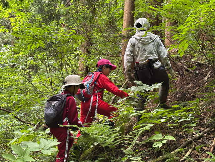 商品の原材料となるオオバクロモジは、地元の許可を得た山に入って採取する。場所によっては斜面に生えていることもある。講師監修のもと「ナガサ」というマタギの鉈を使い、樹高2mほどの木を伐る。山の恵みを得ることをマタギたちは山の神から「授かる」といい、その精神性を受け継ぐ重要な機会にもなっている。採取したクロモジの粉砕や袋詰めも体験する。