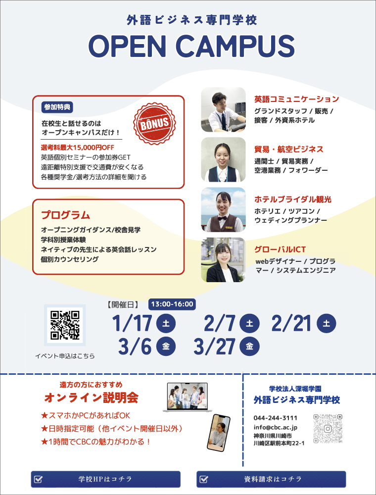オープンキャンパス イベント一覧 すべて 来校型 オンライン型 1/17(土) 13:00~16:00 オープンキャンパス2025 神奈川県川崎市川崎区駅前本町22-1 友達・保護者OK 奨学金制度の紹介 交通費補助 入学に有利 個別相談可能 フリーター・大学生歓迎 参加する 2/7(土) 13:00~16:00 オープンキャンパス2025 神奈川県川崎市川崎区駅前本町22-1 友達・保護者OK 奨学金制度の紹介 交通費補助 入学に有利 個別相談可能 フリーター・大学生歓迎 参加する 2/21(土) 13:00~16:00 オープンキャンパス2025 神奈川県川崎市川崎区駅前本町22-1 友達・保護者OK 奨学金制度の紹介 交通費補助 入学に有利 個別相談可能 フリーター・大学生歓迎 参加する 3/6(金) 13:00~16:00 オープンキャンパス2025 神奈川県川崎市川崎区駅前本町22-1 友達・保護者OK 奨学金制度の紹介 交通費補助 入学に有利 個別相談可能 フリーター・大学生歓迎 参加する 3/27(金) 13:00~16:00 オープンキャンパス2025 神奈川県川崎市川崎区駅前本町22-1 友達・保護者OK 奨学金制度の紹介 交通費補助 入学に有利 個別相談可能 フリーター・大学生歓迎 参加する 1/17(土) 13:00~16:00 オープンキャンパス2025 神奈川県川崎市川崎区駅前本町22-1 友達・保護者OK 奨学金制度の紹介 交通費補助 入学に有利 個別相談可能 フリーター・大学生歓迎 参加する 2/7(土) 13:00~16:00 オープンキャンパス2025 神奈川県川崎市川崎区駅前本町22-1 友達・保護者OK 奨学金制度の紹介 交通費補助 入学に有利 個別相談可能 フリーター・大学生歓迎 参加する 2/21(土) 13:00~16:00 オープンキャンパス2025 神奈川県川崎市川崎区駅前本町22-1 友達・保護者OK 奨学金制度の紹介 交通費補助 入学に有利 個別相談可能 フリーター・大学生歓迎 参加する 3/6(金) 13:00~16:00 オープンキャンパス2025 神奈川県川崎市川崎区駅前本町22-1 友達・保護者OK 奨学金制度の紹介 交通費補助 入学に有利 個別相談可能 フリーター・大学生歓迎 参加する 3/27(金) 13:00~16:00 オープンキャンパス2025 神奈川県川崎市川崎区駅前本町22-1 友達・保護者OK 奨学金制度の紹介 交通費補助 入学に有利 個別相談可能 フリーター・大学生歓迎 参加する 開催スケジュールがありません。 オープンキャンパスのチェックポイント Q. オープンキャンパスに行くメリットは? A. パンフレットやホームページではわからない学校の雰囲気や特徴を知ることができる。オープンキャンパスは、校舎や施設を見学し、説明を聞いたり、質 問したりすることで、学校の雰囲気や特徴を知ることができるイベントだ。興味のある学校にいくつか参加して比較しよう。 ①入学後の生活をイメージできる 学校の雰囲気が体感でき、また授業・実習を体験できるので、入学後のイメージができる。 ②疑問を解消できる 先生や在校生に、入試や授業、学生生活で気になることなどを直接質問ができる。 ③モチベーションがアップする キャンパスを見たり、授業などを体験することで受験や進学へのモチベーションがアップする。 ④入学後のミスマッチが防げる 入学後に「イメージと違った、こんなはずではなかった」と悔やまないように、入学前に学校への理解を深めることができる。 もっと見る Q. オープンキャンパスってどんなことをするの? A. キャンパス見学や体験授業、学校の説明や個別の相談会など、学校を知ることができる絶好のチャンス!オープンキャンパスは、各学校が独自に工夫を凝らしたものとなっ ている。また、友人と参加できるのはもちろん、保護者の方が同伴できるものも多く、保護者向けの説明会や相談会を同時に開催する学校も増えている。オープンキャンパスは、気になる学校をじっくりと観察できる絶好のチャンス。その主な内容を見ていこう。 ●キャンパス見学ツアー 教室、図書館、食堂、体育施設などさまざまな施設・設備を見学。在校生たちがガイド役となって、説明しながら案内してくれる場合が多い。 ●模擬授業・体験授業 講義や実習などを体験することができる。実際に行われている研究や学びの内容を知る大変よい機会となる。 ●学校説明会 学校全体の説明から、学部・学科・コースの内容説明、就職支援体制や就職実績、奨学金制度の紹介などが行われる。保護者向けの説明会を設けている学校もある。 ●入試説明会 一見複雑な入試方式の特徴やポイントを解説してくれる。入試対策のアドバイスが聞けたり、入試対策講座を実施する学校もあるようだ。 ●個別相談会 学校の担当者に、入試、奨学金、就職支援などの疑問を個別に相談ができる。また保護者向けに個別相談の時間を設けている学校もある。 ●その他 オープンキャンパスの参加が、総合型選抜(AO入試)のエントリーを兼ねていたり、オープンキャンパス会場でエントリー受付を行っていたりする学校もある。 ■タイムスケジュール例1 9:30~ 10:00~ 10:30~ 11:10~ 12:20~ 本人 受付開始 学校説明会 模擬授業 キャンパスツアー 昼食 保護者 受付開始 保護者説明会 模擬授業 保護者相談会 昼食 ■タイムスケジュール例2 9:00~ 10:00~ 