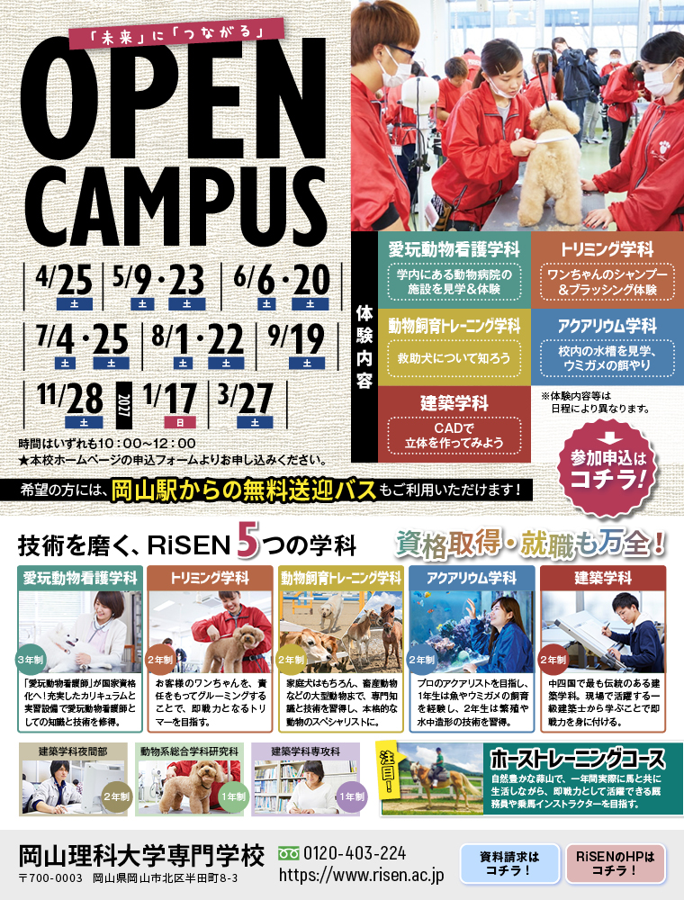 オープンキャンパス イベント一覧 すべて 来校型 オンライン型 4/25(土) 10:00~12:00 「未来」に「つながる」 RiSENのオープンキャンパス 【建築学科】 岡山県岡山市北区半田町8-3 友達・保護者OK 奨学金制度の紹介 参加する 4/25(土) 10:00~12:00 「未来」に「つながる」 RiSENのオープンキャンパス 【愛玩動物看護学科】 岡山県岡山市北区半田町8-3 友達・保護者OK 奨学金制度の紹介 参加する 4/25(土) 10:00~12:00 「未来」に「つながる」 RiSENのオープンキャンパス 【トリミング学科】 岡山県岡山市北区半田町8-3 友達・保護者OK 奨学金制度の紹介 参加する 4/25(土) 10:00~12:00 「未来」に「つながる」 RiSENのオープンキャンパス 【動物飼育トレーニング学科】 岡山県岡山市北区半田町8-3 友達・保護者OK 奨学金制度の紹介 参加する 4/25(土) 10:00~12:00 「未来」に「つながる」 RiSENのオープンキャンパス 【アクアリウム学科】 岡山県岡山市北区半田町8-3 友達・保護者OK 奨学金制度の紹介 参加する 5/9(土) 10:00~12:00 「未来」に「つながる」 RiSENのオープンキャンパス 【建築学科】 岡山県岡山市北区半田町8-3 友達・保護者OK 奨学金制度の紹介 参加する 5/9(土) 10:00~12:00 「未来」に「つながる」 RiSENのオープンキャンパス 【愛玩動物看護学科】 岡山県岡山市北区半田町8-3 友達・保護者OK 奨学金制度の紹介 参加する 5/9(土) 10:00~12:00 「未来」に「つながる」 RiSENのオープンキャンパス 【トリミング学科】 岡山県岡山市北区半田町8-3 友達・保護者OK 奨学金制度の紹介 参加する 5/9(土) 10:00~12:00 「未来」に「つながる」 RiSENのオープンキャンパス 【動物飼育トレーニング学科】 岡山県岡山市北区半田町8-3 友達・保護者OK 奨学金制度の紹介 参加する 5/9(土) 10:00~12:00 「未来」に「つながる」 RiSENのオープンキャンパス 【アクアリウム学科】 岡山県岡山市北区半田町8-3 友達・保護者OK 奨学金制度の紹介 参加する 5/23(土) 10:00~12:00 「未来」に「つながる」 RiSENのオープンキャンパス 【建築学科】 岡山県岡山市北区半田町8-3 友達・保護者OK 奨学金制度の紹介 参加する 5/23(土) 10:00~12:00 「未来」に「つながる」 RiSENのオープンキャンパス 【愛玩動物看護学科】 岡山県岡山市北区半田町8-3 友達・保護者OK 奨学金制度の紹介 参加する 5/23(土) 10:00~12:00 「未来」に「つながる」 RiSENのオープンキャンパス 【トリミング学科】 岡山県岡山市北区半田町8-3 友達・保護者OK 奨学金制度の紹介 参加する 5/23(土) 10:00~12:00 「未来」に「つながる」 RiSENのオープンキャンパス 【動物飼育トレーニング学科】 岡山県岡山市北区半田町8-3 友達・保護者OK 奨学金制度の紹介 参加する 5/23(土) 10:00~12:00 「未来」に「つながる」 RiSENのオープンキャンパス 【アクアリウム学科】 岡山県岡山市北区半田町8-3 友達・保護者OK 奨学金制度の紹介 参加する 6/6(土) 10:00~12:00 「未来」に「つながる」 RiSENのオープンキャンパス 【建築学科】 岡山県岡山市北区半田町8-3 友達・保護者OK 奨学金制度の紹介 参加する 6/6(土) 10:00~12:00 「未来」に「つながる」 RiSENのオープンキャンパス 【愛玩動物看護学科】 岡山県岡山市北区半田町8-3 友達・保護者OK 奨学金制度の紹介 参加する 6/6(土) 10:00~12:00 「未来」に「つながる」 RiSENのオープンキャンパス 【トリミング学科】 岡山県岡山市北区半田町8-3 友達・保護者OK 奨学金制度の紹介 参加する 6/6(土) 10:00~12:00 「未来」に「つながる」 RiSENのオープンキャンパス 【動物飼育トレーニング学科】 岡山県岡山市北区半田町8-3 友達・保護者OK 奨学金制度の紹介 参加する 6/6(土) 10:00~12:00 「未来」に「つながる」 RiSENのオープンキャンパス 【アクアリウム学科】 岡山県岡山市北区半田町8-3 友達・保護者OK 奨学金制度の紹介 参加する 6/20(土) 10:00~12:00 「未来」に「つながる」 RiSENのオープンキャンパス 【建築学科】 岡山県岡山市北区半田町8-3 友達・保護者OK 奨学金制度の紹介 参加する 6/20(土) 10:00~12:00 「未来」に「つながる」 RiSENのオープンキャンパス 【愛玩動物看護学科】 岡山県岡山市北区半田町8-3 友達・保護者OK 奨学金制度の紹介 参加する 6/20(土) 10:00~12:00 「未来」に「つながる」 RiSENのオープンキャンパス 【トリミング学科】 岡山県岡山市北区半田町8-3 友達・保護者OK 奨学金制度の紹介 参加する 6/20(土) 10:00~12:00 「未来」に「つながる」 RiSENのオープンキャンパス 【動物飼育トレーニング学科】 岡山県岡山市北区半田町8-3 友達・保護者OK 奨学金制度の紹介 参加する 6/20(土) 10:00~12:00 「未来」に「つながる」 RiSENのオープンキャンパス 【アクアリウム学科】 岡山県岡山市北区半田町8-3 友達・保護者OK 奨学金制度の紹介 参加する 7/4(土) 10:00~12:00 「未来」に「つながる」 RiSENのオープンキャンパス 【建築学科】 岡山県岡山市北区半田町8-3 友達・保護者OK 奨学金制度の紹介 参加する 7/4(土) 10:00~12:00 「未来」に「つながる」 RiSENのオープンキャンパス 【愛玩動物看護学科】 岡山県岡山市北区半田町8-3 友達・保護者OK 奨学金制度の紹介 参加する 7/4(土) 10:00~12:00 「未来」に「
